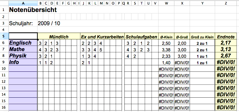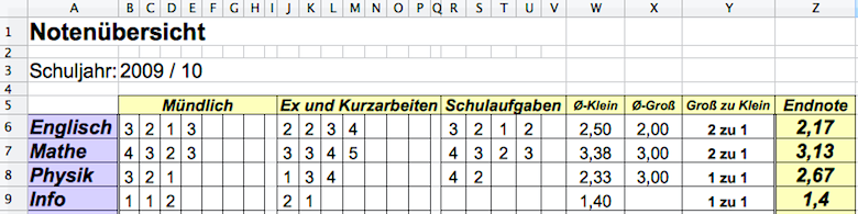 Wozu die ganze Tabellenkalkulation gut ist, kannst Du Dir selbst beantworten. Total praktisch ist es, wenn Du ständig einen Überblick darüber hast, welche schulischen Leistungen Du erbracht hast und auf welcher Gesamtnote Du aktuell stehst.
