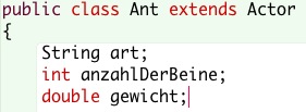 - Lade Dir folgendes Greenfoot-Projekt herunter: GF-02-Turtle. Öffne das Projekt und gib der Schildkröte die Attribute Alter, Namen und Farbe. Außerdem soll ein Attribut kennzeichnen, ob die Schildkröte eine Meeresschildkröte oder eine Landschildkröte ist. Wenn Du fertig bist, dann sag bescheid! Die Attributwerte setzen wir dann gemeinsam mit dem Informatiklehrer über den Konstruktor!