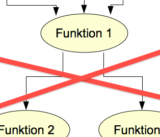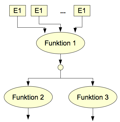 Funktionen haben in der Tabellenkalkulation (und in den meisten Programmiersprachen) nur einen einzigen Ausgabewert. Das heißt, im Datenflussdiagramm ragt nur ein Pfeil aus den Ellipsen!