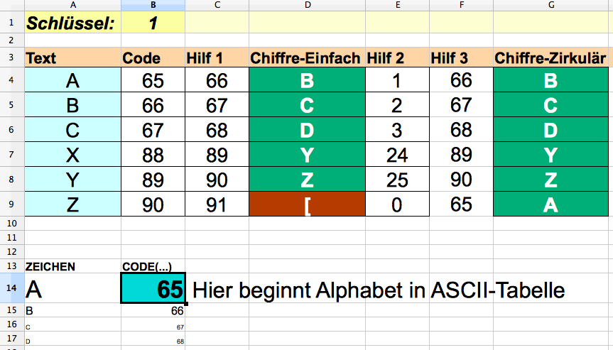 In Spalte D siehst Du den ersten, einfachen Versuch der Umsetzung der Cäsar-Verschlüsselung. Diese funktioniert nicht ganz wie vorgesehen, denn für den Buchstaben „Z“ soll keine eckige Klammer als Chiffre generiert werden sondern natürlich ein entsprechender Buchstabe im Alphabet (hier im Beispiel Buchstabe „A“). Gehe zunächst trotzdem Schritt für Schritt mit Hilfsspalten vor, und baue erstmal die Einfache Version. Funktioniert diese, machst Du weiter bis Du schließlich die korrekte Lösung in Spalte G generierst!
