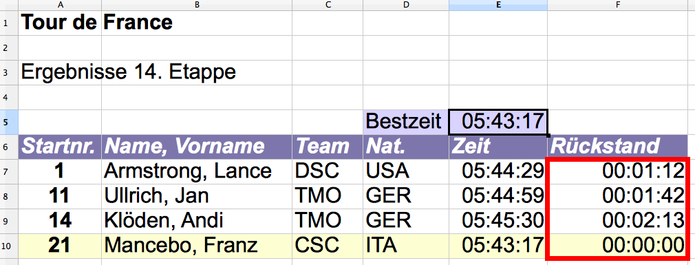 Für die Rückstandsberechnungen in Spalte F wird jedesmal auf die berechnete Bestzeit in Zelle E5 zurückgegriffen.