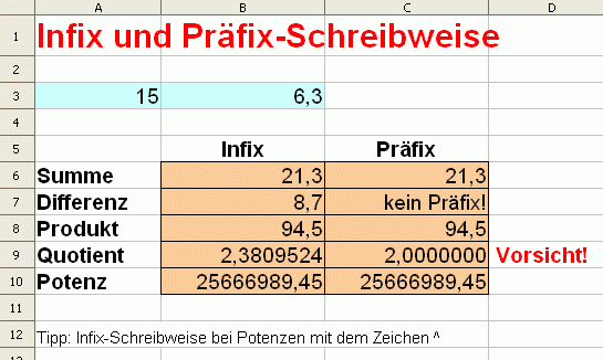 Erstelle dazu dieses Rechenblatt. In den Zellen B6 bis B10 wurde die Infix-Schreibweise verwendet, in den Spalten C6 bis C10 die Präfix-Schreibweise.