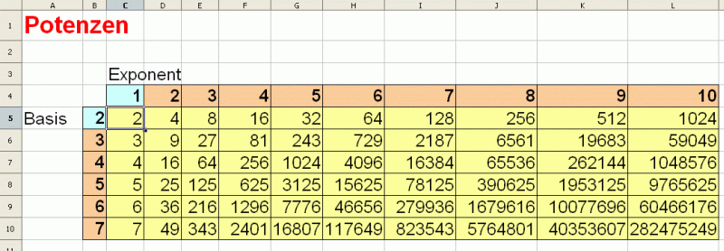 So steht in Zelle C5 die Funktion POTENZ($B5;C$4) in Präfixschreibweise.