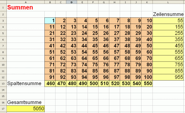 Dieses Rechenblatt berechnet die Summe der ersten 100 natürlichen Zahlen.