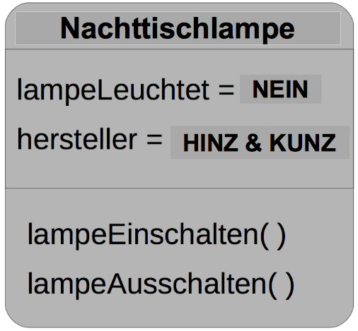 Lass uns das Informatikdenken trainieren – wir wollen hinter die Kulissen blicken: klar, die Methode lampeEinschalten in der oben dargestellten Objektkarte wird vermutlich die Nachttischlampe einschalten. Aber was bedeutet das genau aus Informatiksicht – was geschieht im Hintergrund beim Aufrufen dieser Methode?