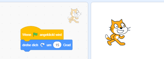 2. Wenn Du auf ein Objekt klickst passt sich das mittlere Fensterdrittel an das Objekt an. In diesem Bereich kannst Du das Objekt steuern, indem Du seine Methoden aufrufst. Versuche die unten abgebildeten „Steuerungsblöcke“ in Deinem Scratch zu erzeugen!Den „drehe 15 Grad“-Block kannst Du auch durch andere ersetzen. Probier es aus und gib jedem Deiner Objekte verschiedene blaue Steuerungsblöcke!